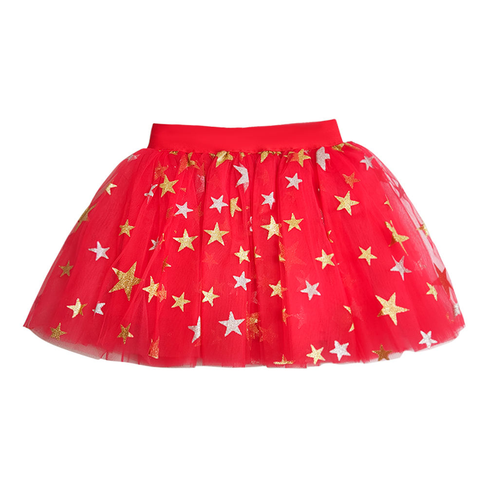 Limited edition Christmas style. Red with gold and silver stars. 4 layers of soft tulle with cotton shorts underneath and thick luxurious satin waist band.